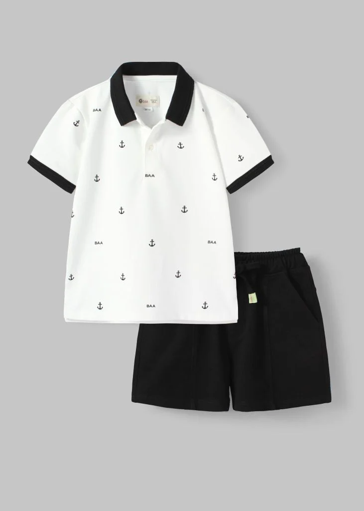 White and Black Boy’s Polo Set with Anchor Pattern